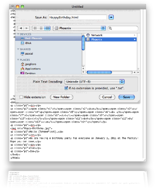 <body> <p class="p1"><br></p> <p class="p2"><span class="s1">H</span><span class="s2"><b>a</b></span><span class="s3">p</span><span class="s4">p</span><span class="s5">y</span><span class="s6"><b> </b></span><span class="s7">B</span><span class="s8"><i>i</i></span><span class="s9">r</span><span class="s10"><b><i>t</i></b></span><span class="s11"><b>h</b></span><span class="s12">d</span><span class="s13"><i>a</i></span><span class="s14">y</span>!</p> <p class="p1"><br></p> <img src="Happy-Birthday.jpg"> <p class="p3">Hello {ToNameFirst},</p> <p class="p1"><br></p> <p class="p3">We are having a birthday party for everyone on January 1, 2013 at The Factory! Hope you can come.</p> <p class="p1"><br></p> <p class="p3">Ciao</p> <p class="p3">Joe</p> </body>Now save the file as "HappyBirthday.html" on your desktop. It must be saved right next to the balloon image you saved to your desktop earlier. Do not save the file with a "txt" extension, but rather an "html" extension: