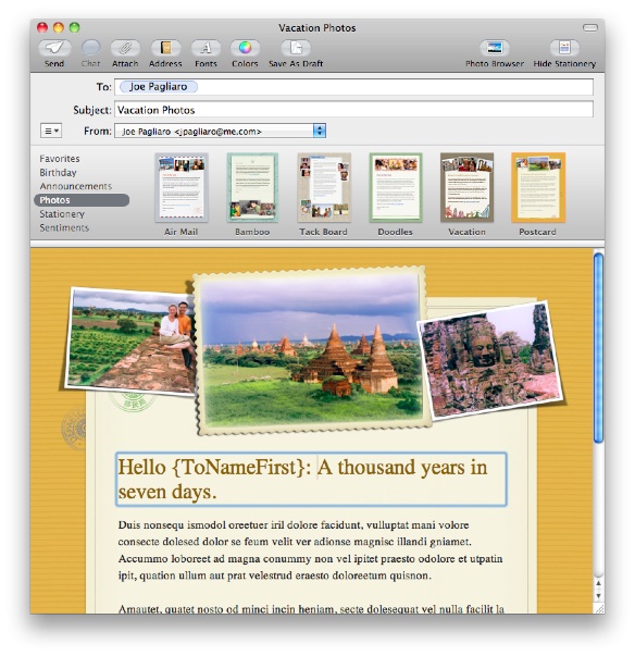 In this example I chose the "Postcard" stationery available in the "Photos" category, and I inserted the template tag "{ToNameFirst}" in the first line so that each message greets the recipient of the message by their first name, as in "Hello Joe":