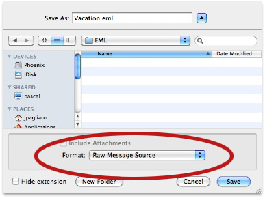 Select "Raw Message Source" as the format in the Save dialog, as shown here: