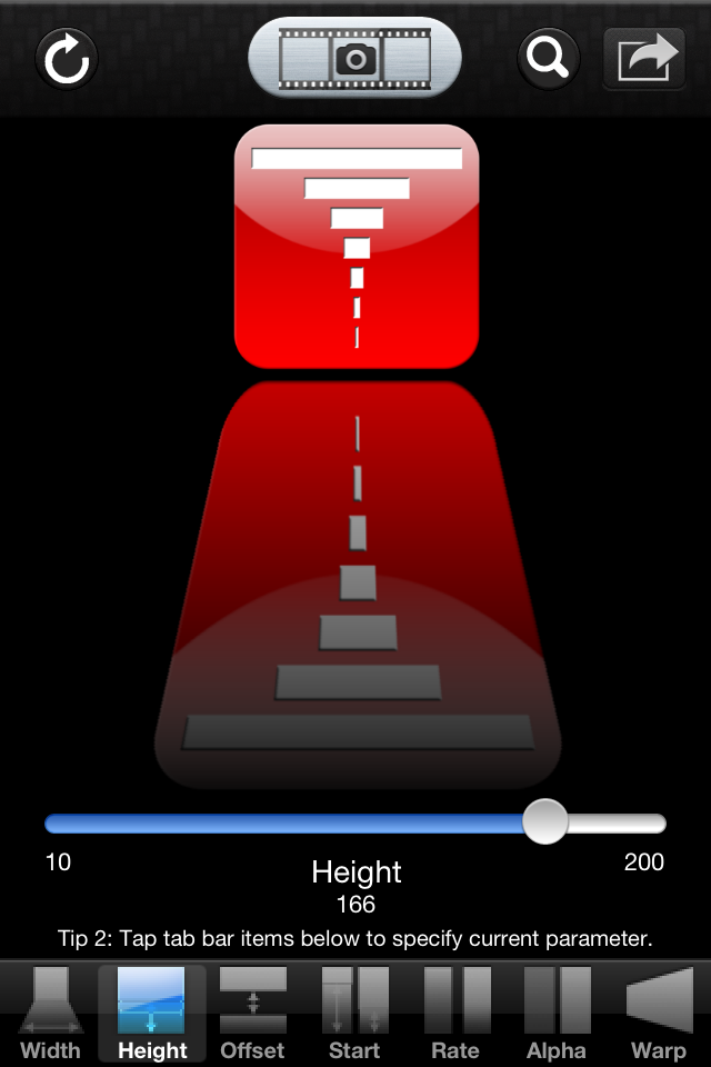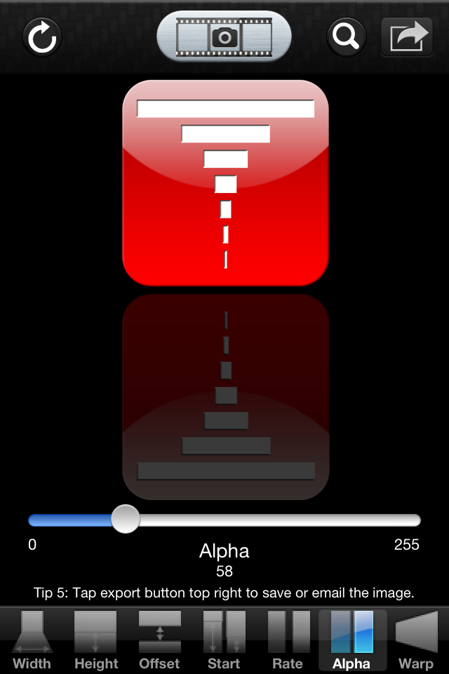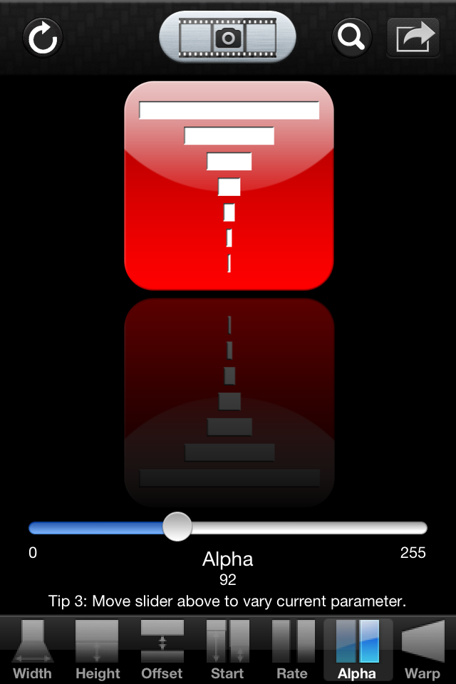 Once a photo is loaded, it is reflected, and use the parameter tab bar at the bottom of the view to configure the attributes of the reflection. There are seven attributes: